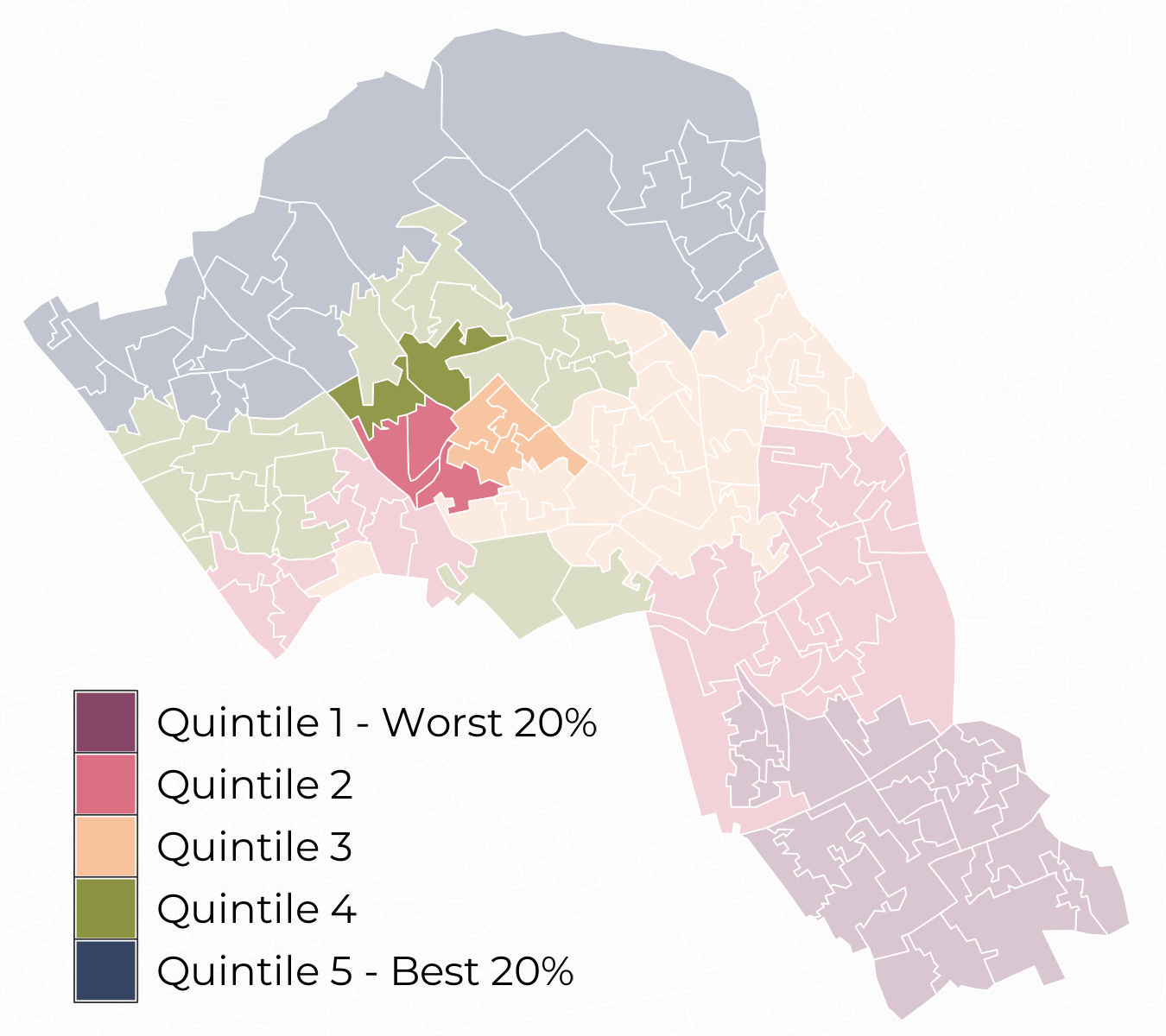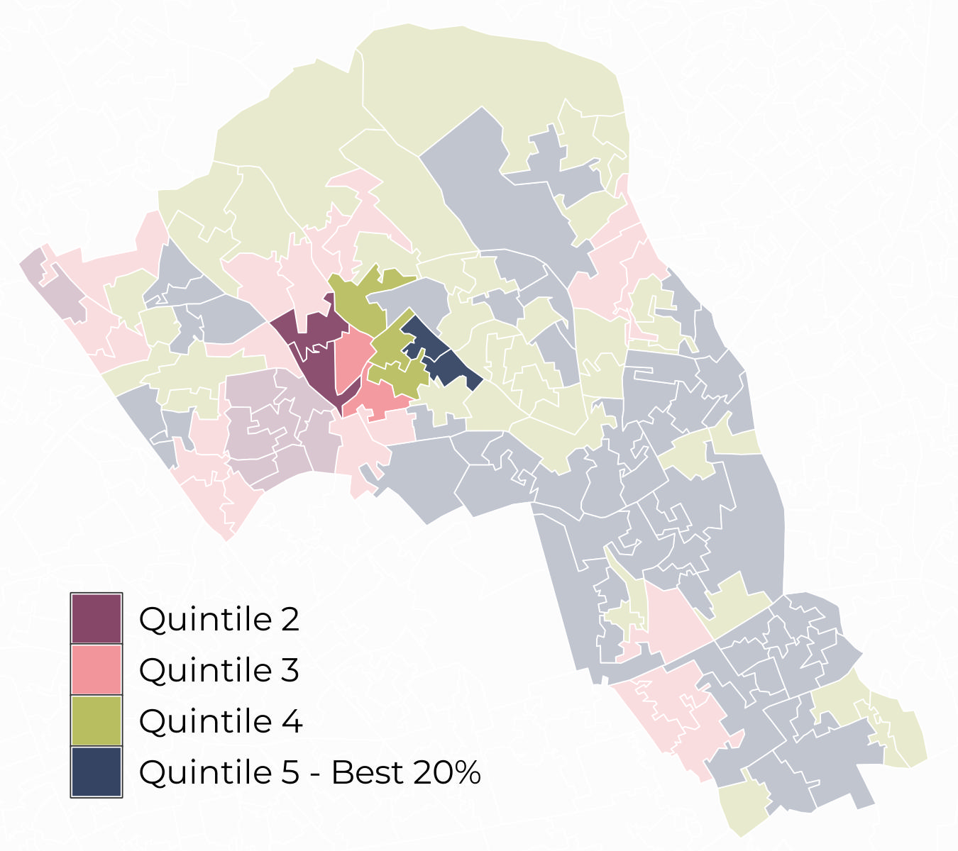 Most Lower Super Output Areas (LSOA) in Belsize sit within Quintile 4 for access to green spaces and within Quintile 3 for air quality.