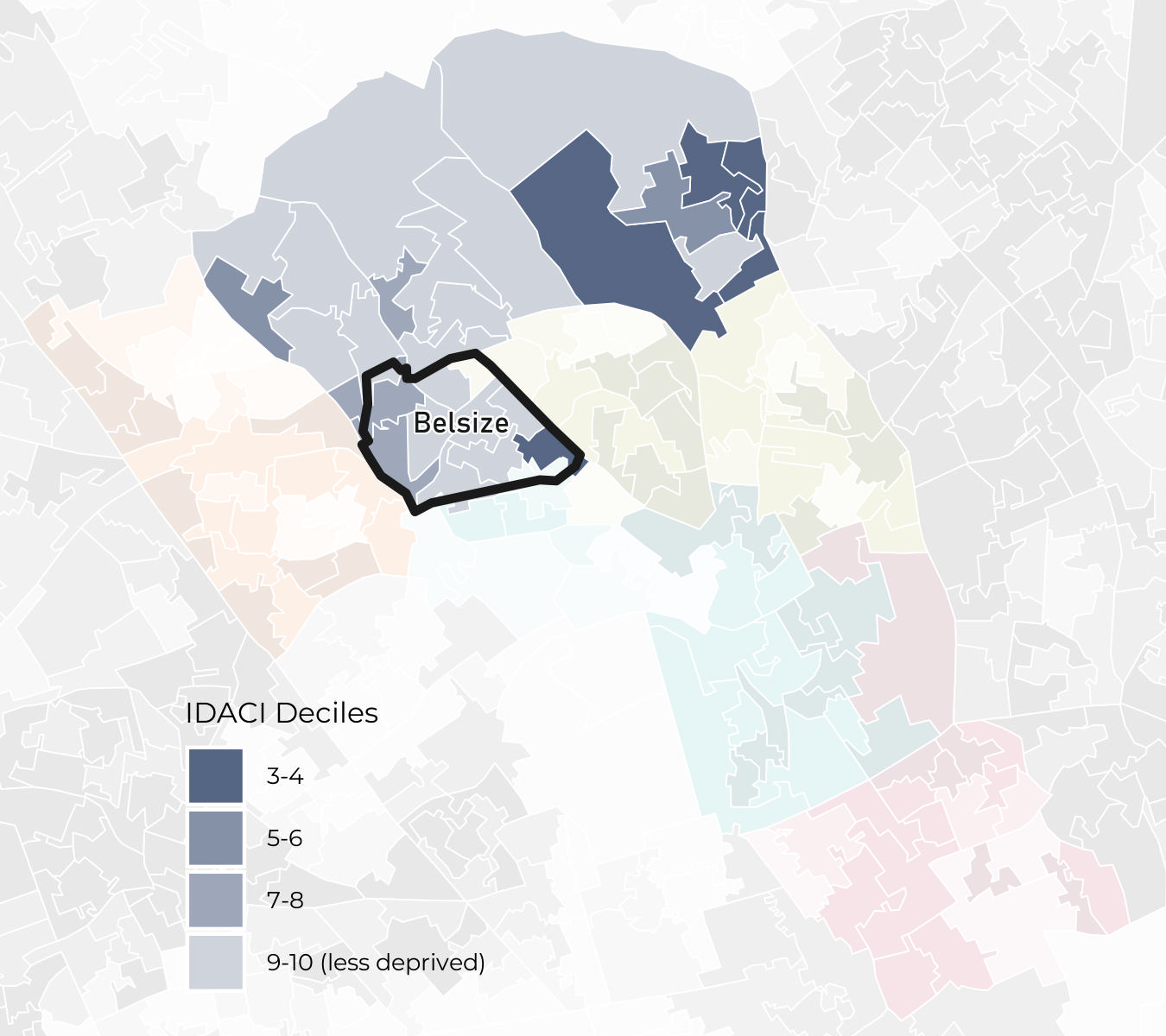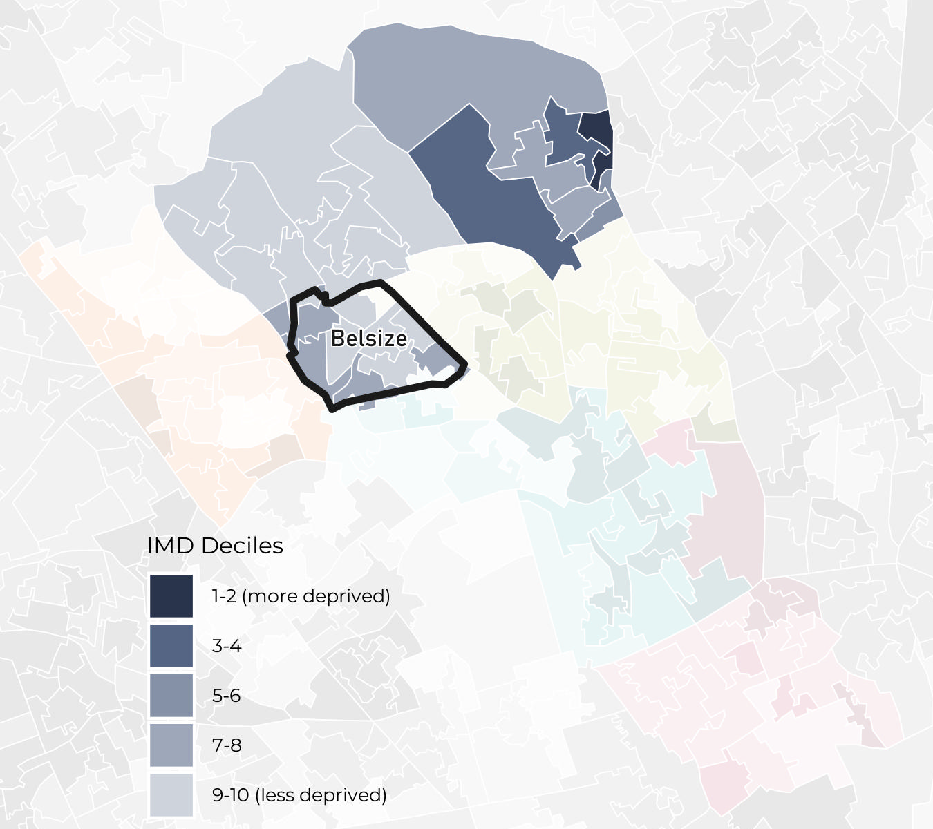 Belsize ward has IMD deciles ranging from decile 7 to decile 10. Note that the least deprived decile is decile 10.
