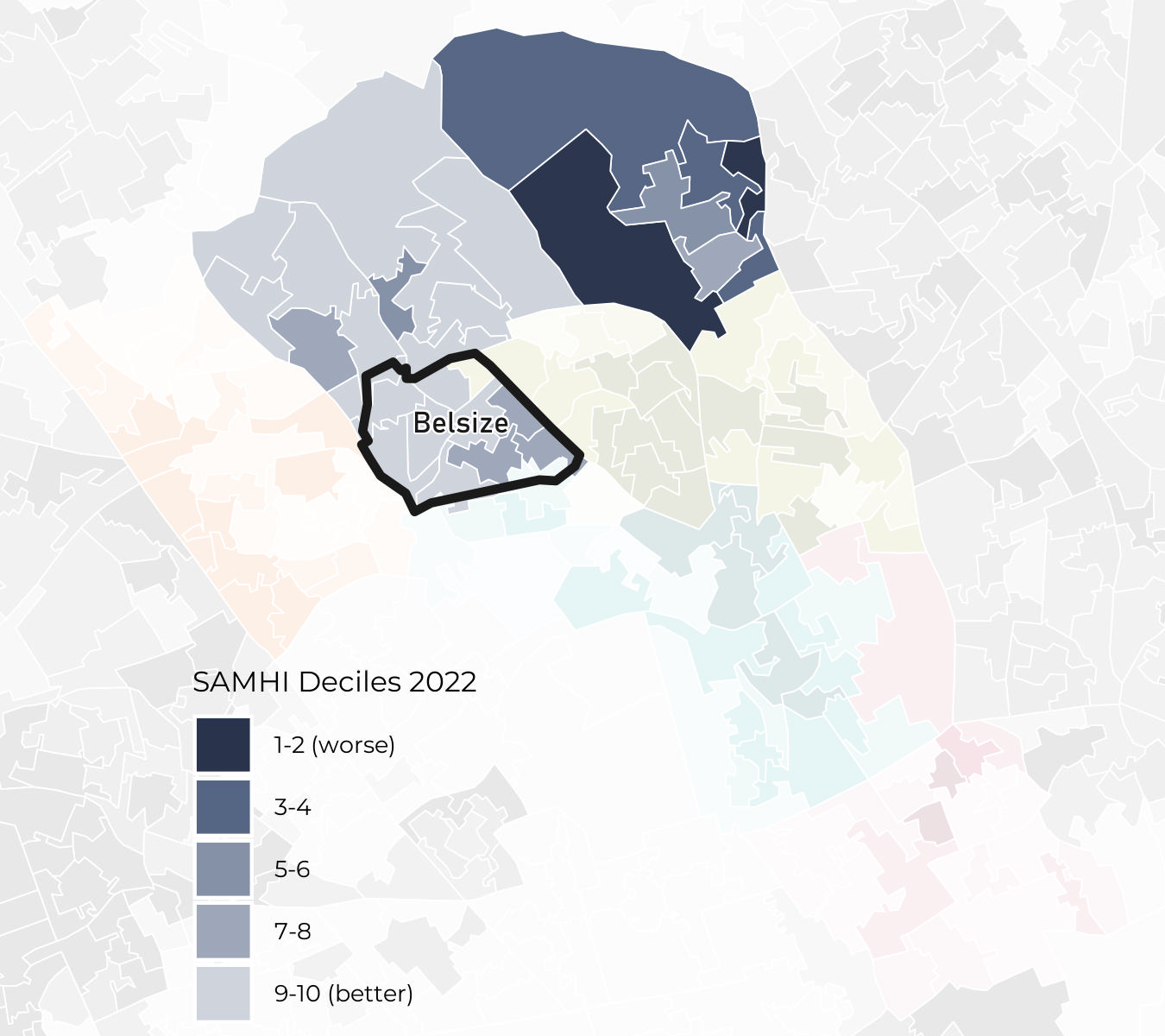 Belsize ward has SAMHI deciles ranging from decile 7 to decile 10. Note that the best decile is decile 10.