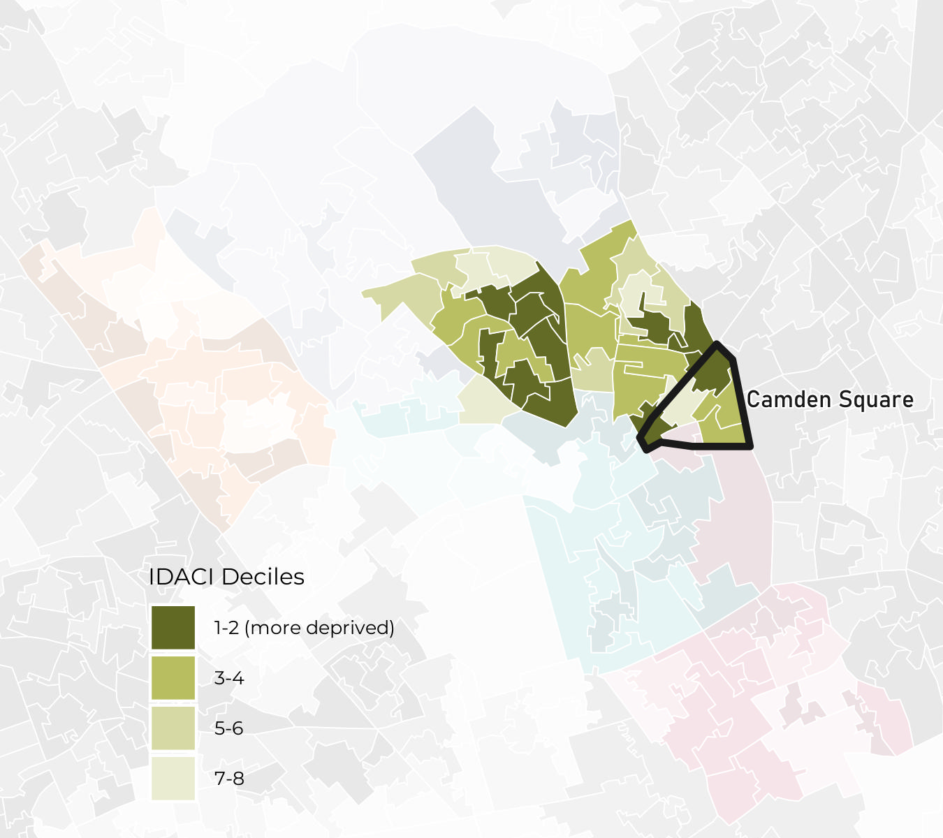 Camden Square ward has IMD deciles ranging from decile 2 to decile 7. Note that the least deprived decile is decile 10.