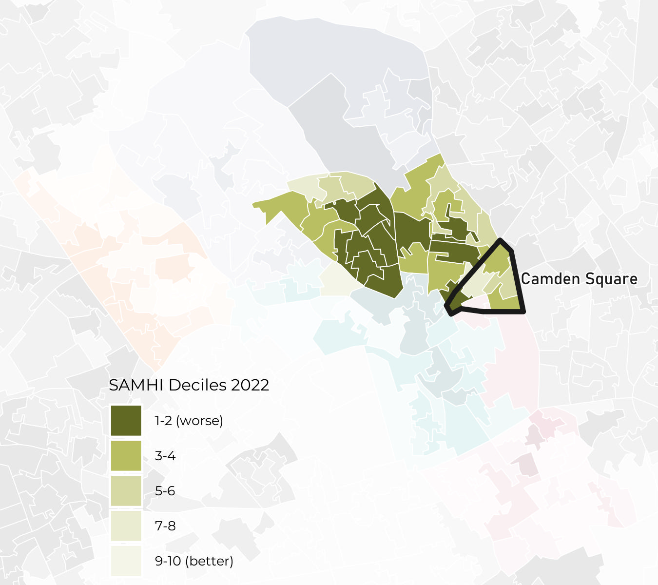 Camden Square ward has SAMHI deciles ranging from decile 2 to decile 7. Note that the best decile is decile 10.