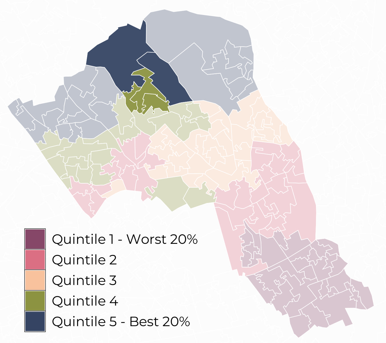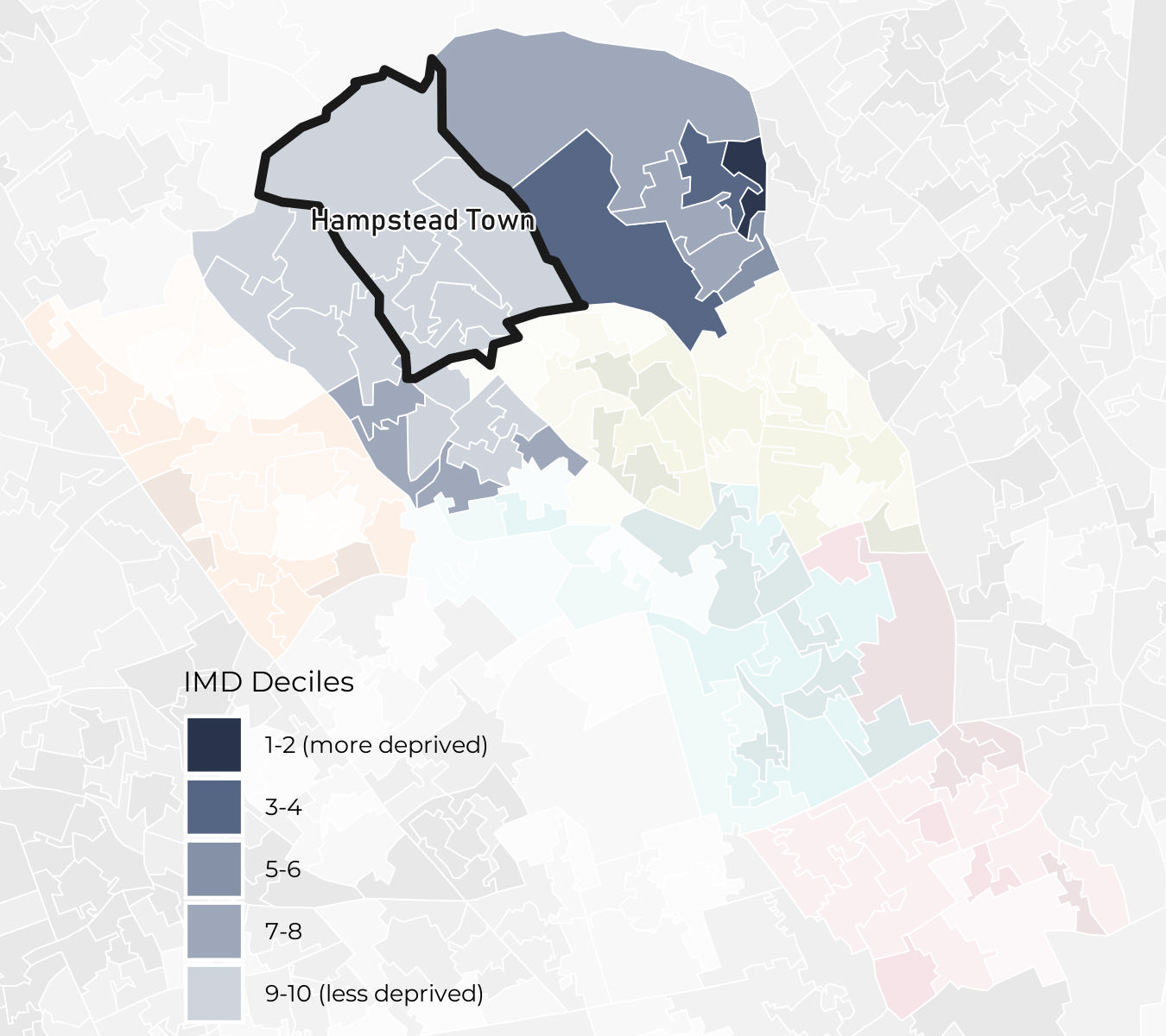 Hampstead Town ward has IMD deciles ranging from decile 9 to decile 10. Note that the least deprived decile is decile 10.