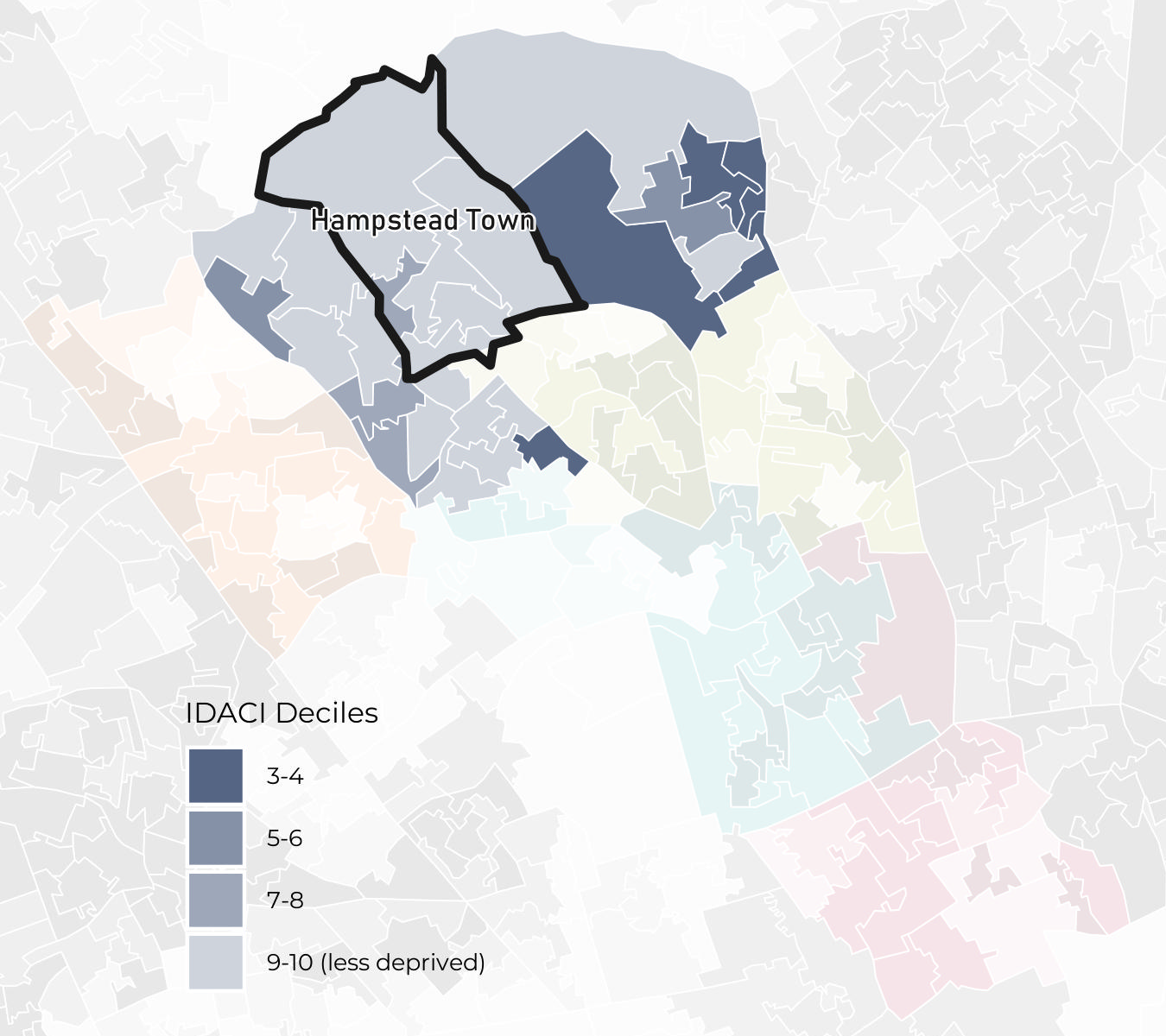 Hampstead Town ward has IDACI (Income Deprivation Affecting Children Index) deciles ranging from decile 7 to decile 10. Note that the least deprived decile is decile 10.