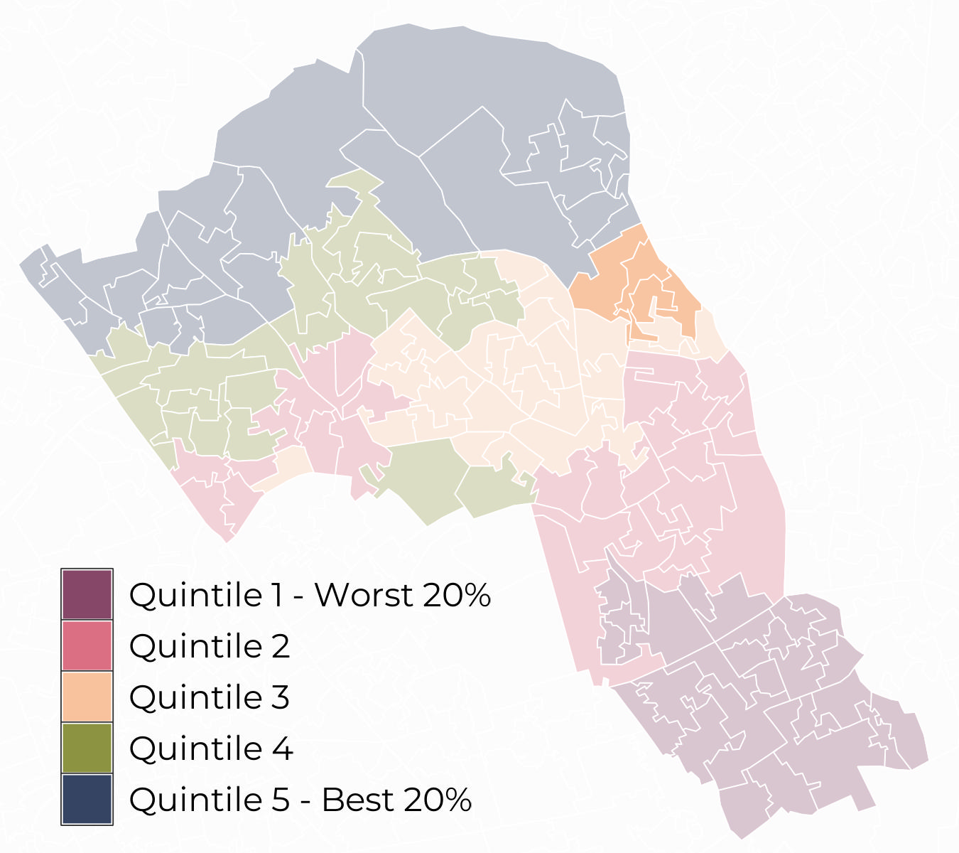 Most Lower Super Output Areas (LSOA) in Kentish Town North sit within Quintile 3 for access to green spaces and within Quintile 3 for air quality.