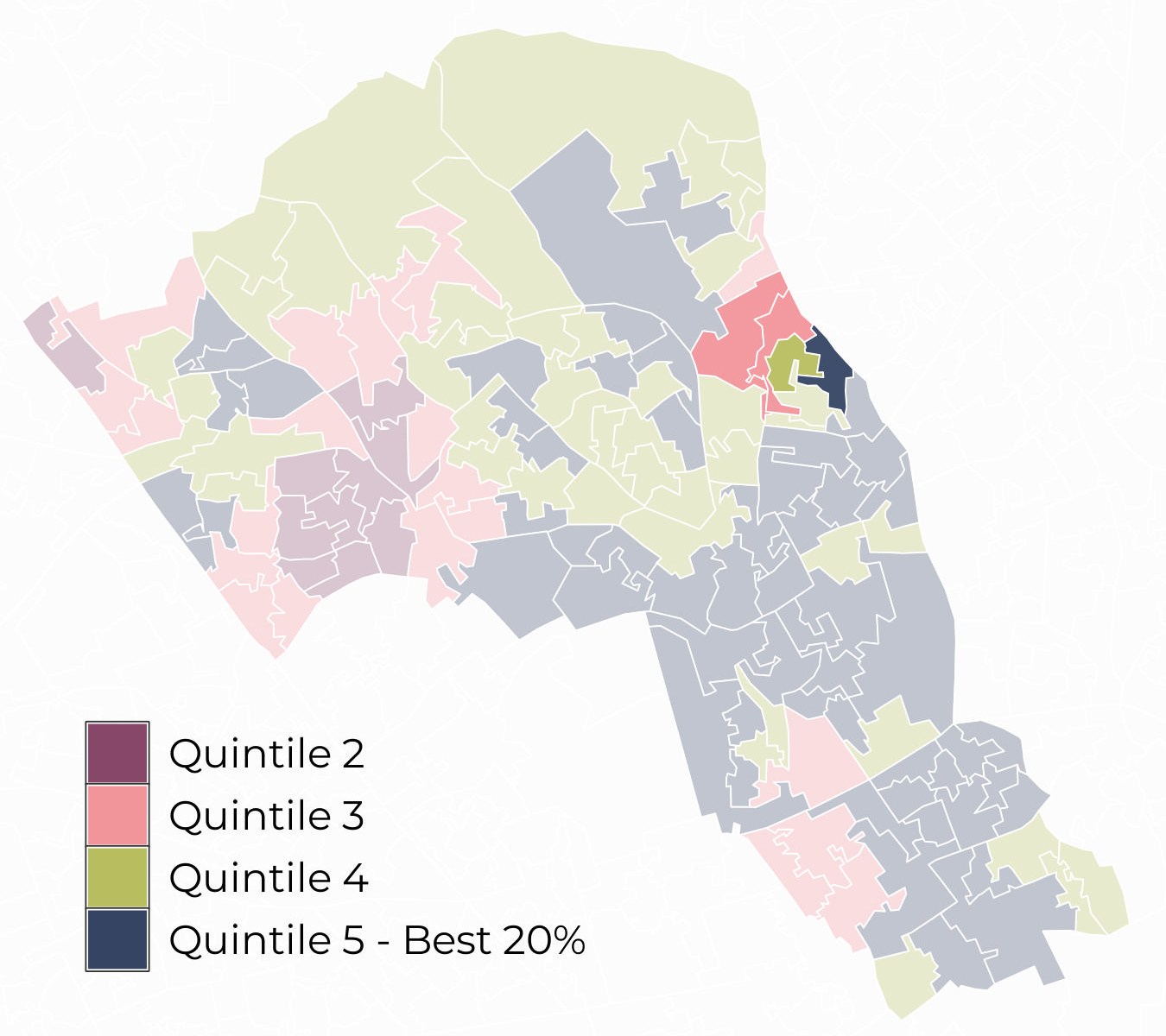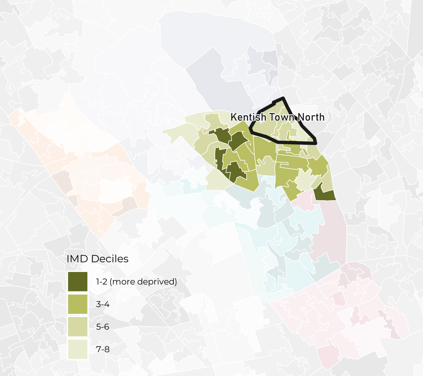 Kentish Town North ward has IMD deciles ranging from decile 5 to decile 7. Note that the least deprived decile is decile 10.