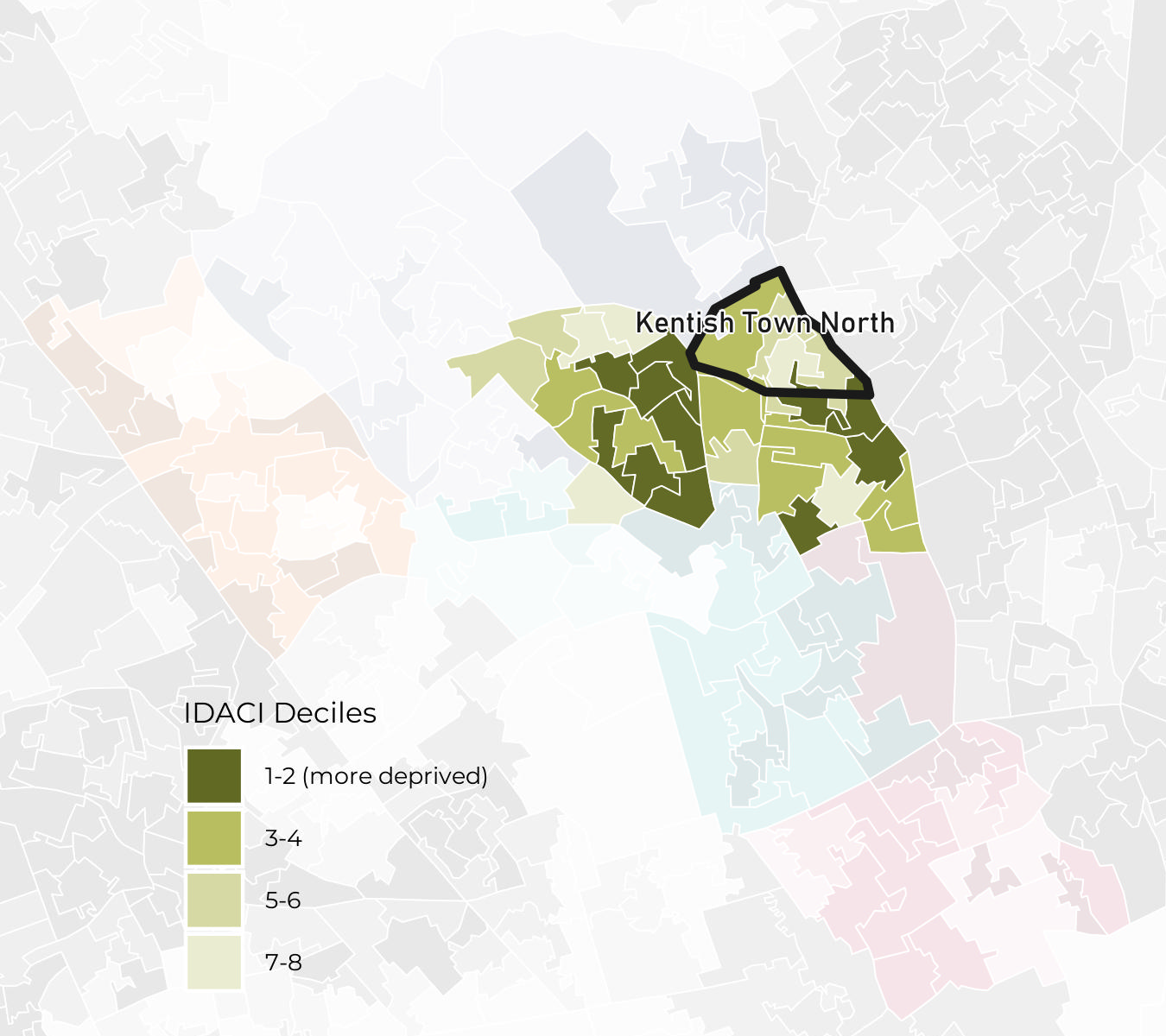 Kentish Town North ward has IDACI (Income Deprivation Affecting Children Index) deciles ranging from decile 3 to decile 7. Note that the least deprived decile is decile 10.