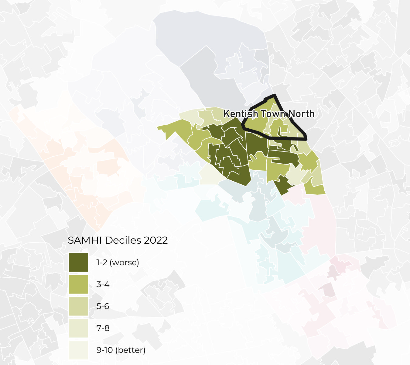 Kentish Town North ward has SAMHI deciles ranging from decile 3 to decile 5. Note that the best decile is decile 10.