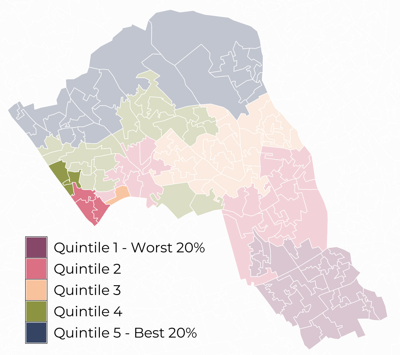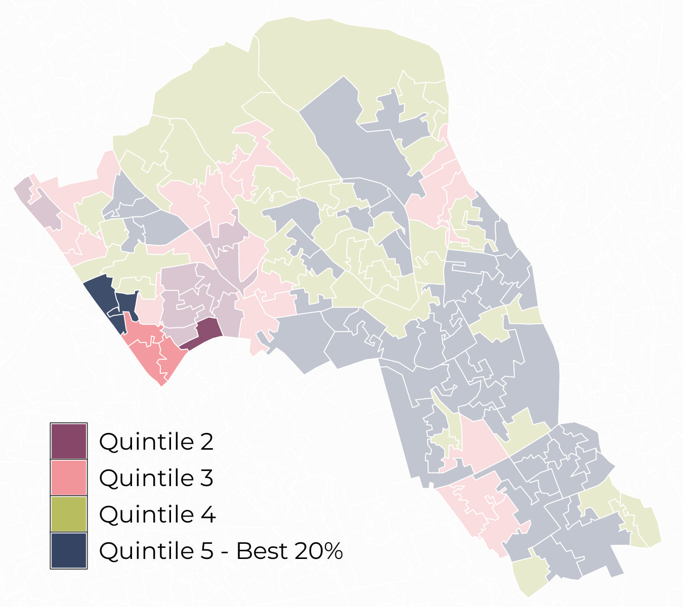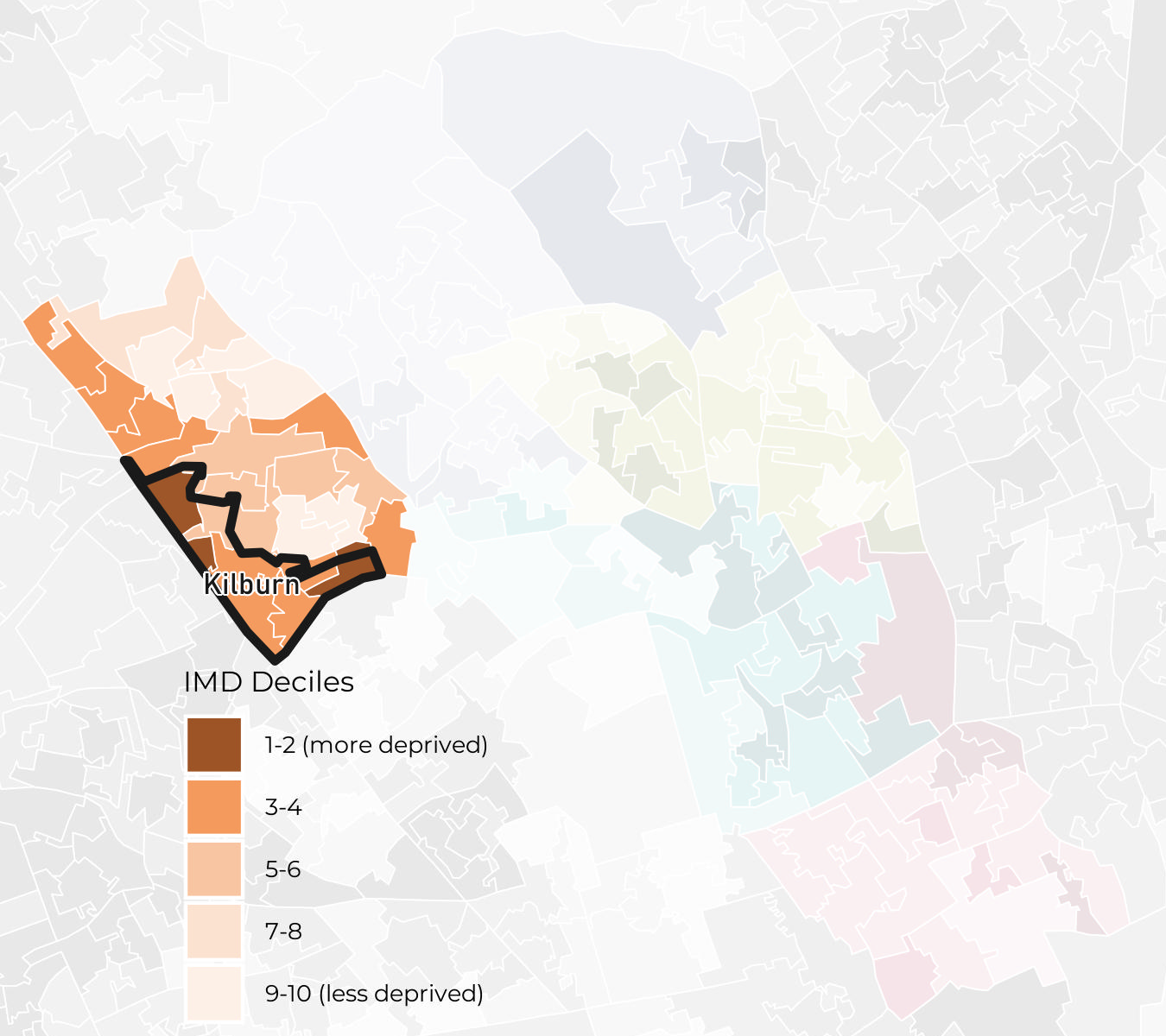 Kilburn ward has IMD deciles ranging from decile 2 to decile 5. Note that the least deprived decile is decile 10.