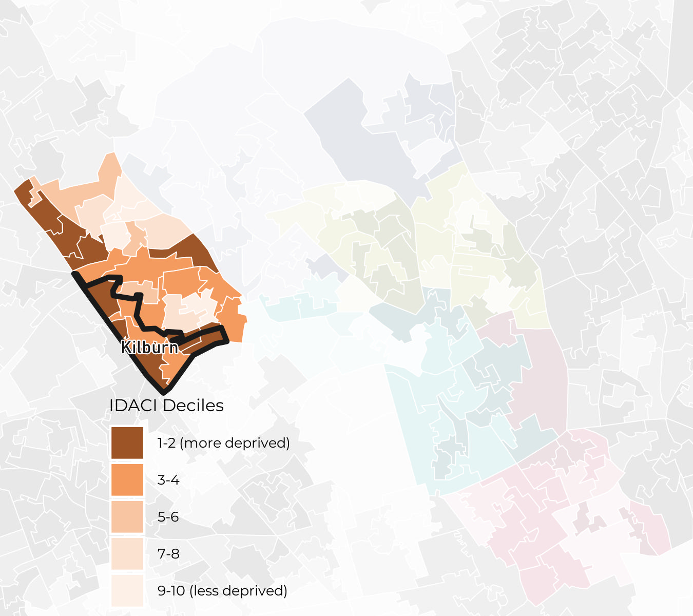 Kilburn ward has IDACI (Income Deprivation Affecting Children Index) deciles ranging from decile 1 to decile 3. Note that the least deprived decile is decile 10.