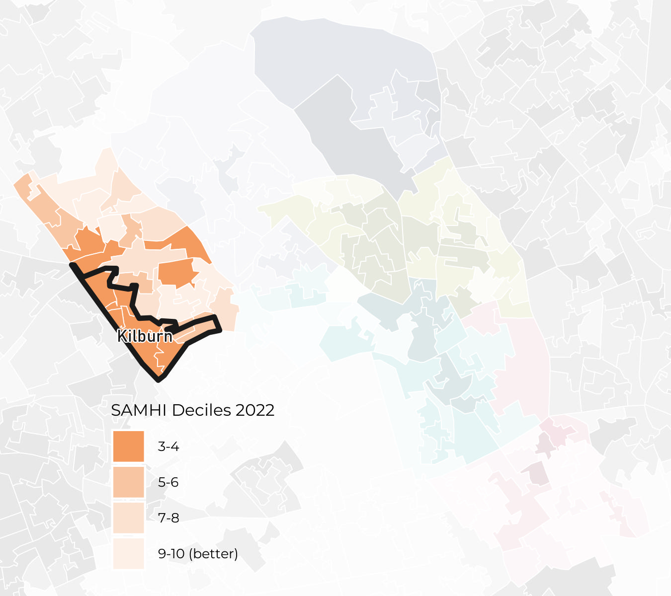 Kilburn ward has SAMHI deciles ranging from decile 3 to decile 5. Note that the best decile is decile 10.