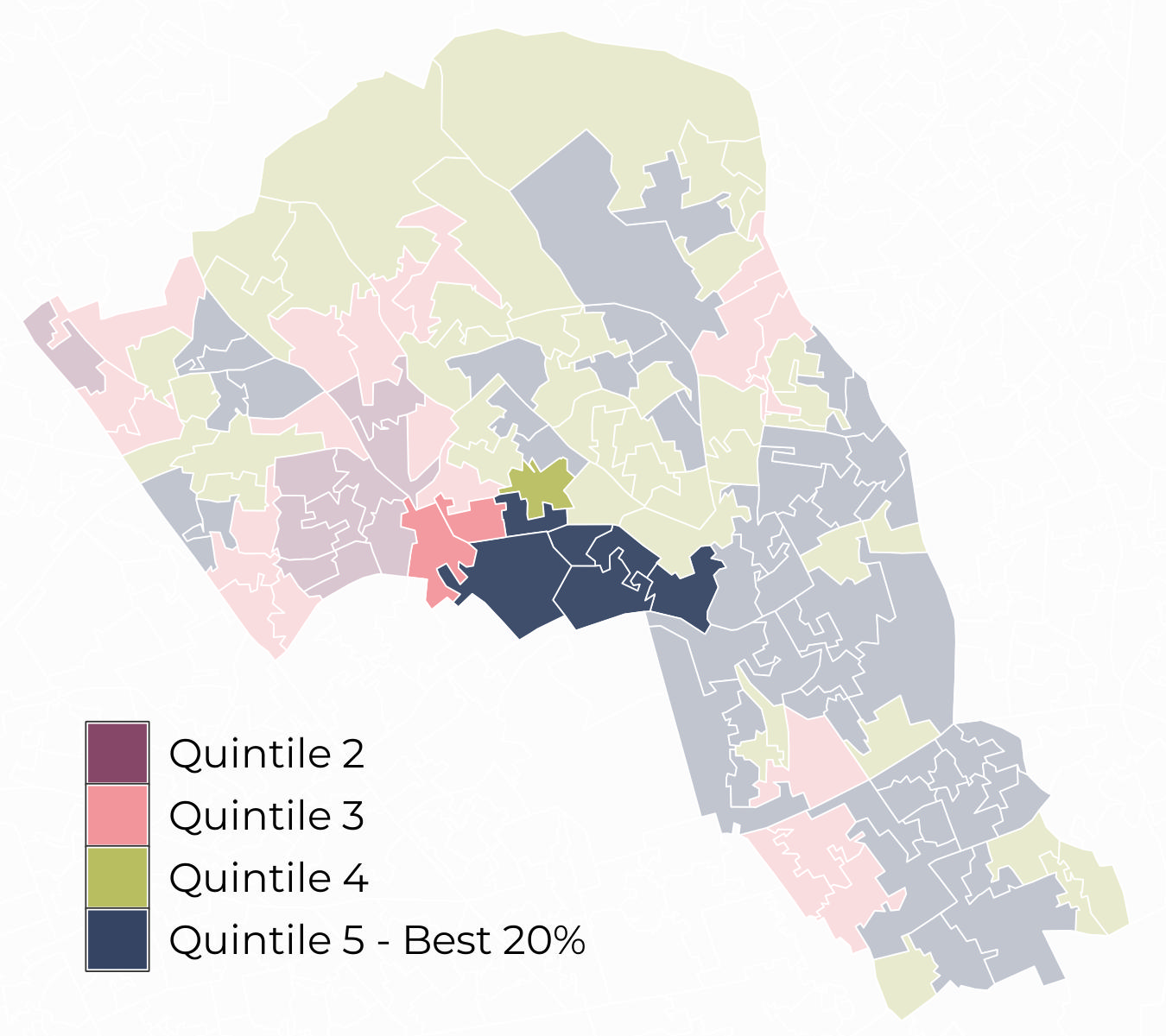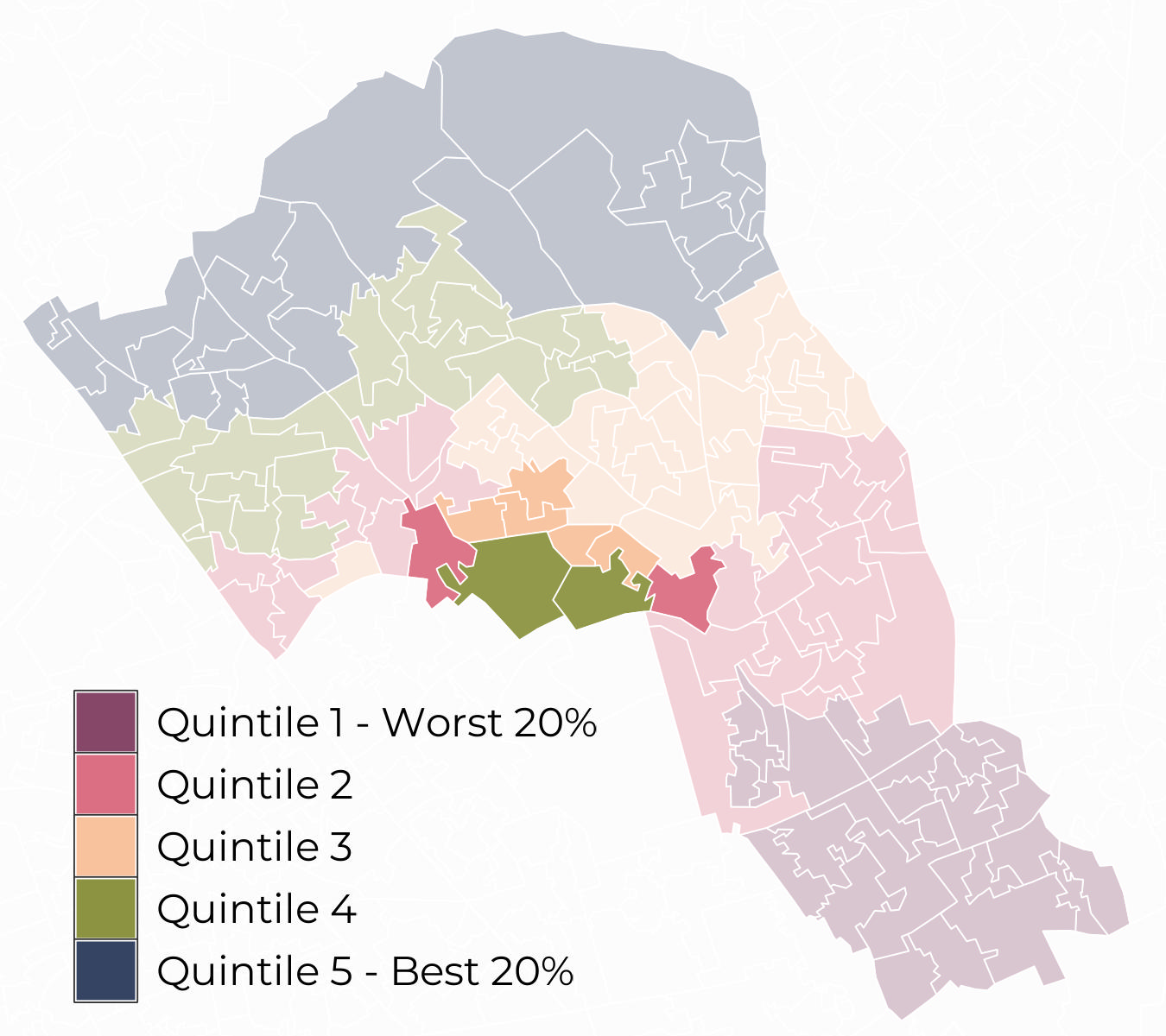 Most Lower Super Output Areas (LSOA) in Primrose Hill sit within Quintile 5 for access to green spaces and within Quintile 3 for air quality.