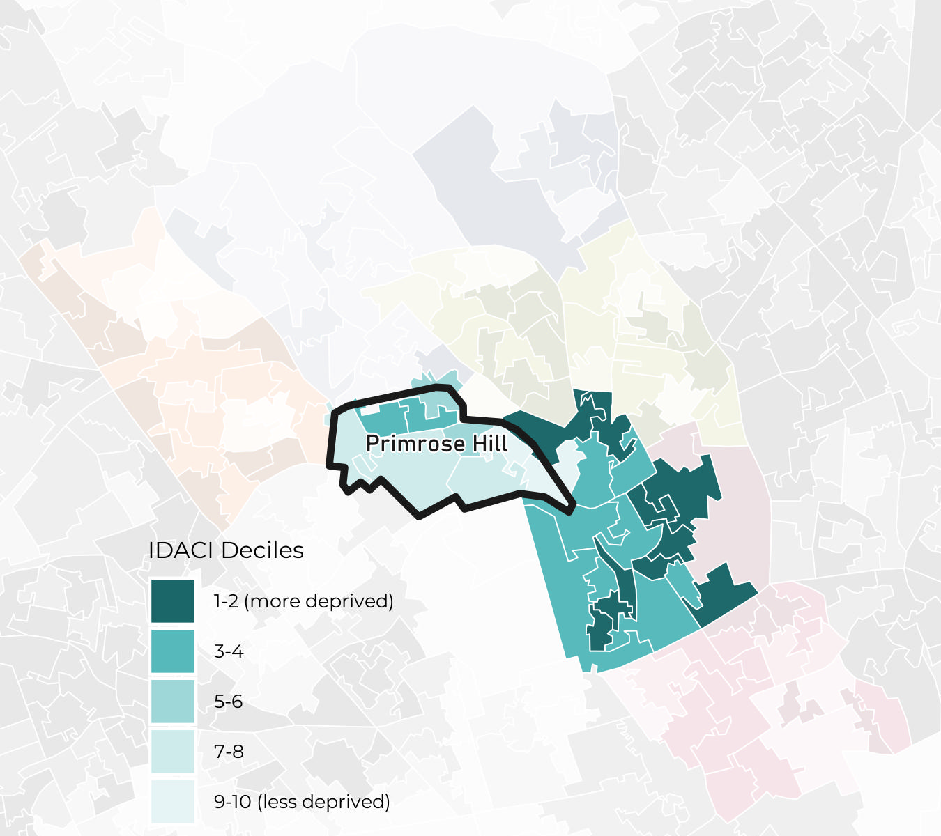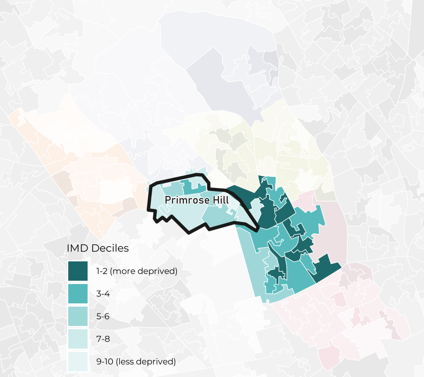 Primrose Hill ward has IMD deciles ranging from decile 4 to decile 9. Note that the least deprived decile is decile 10.