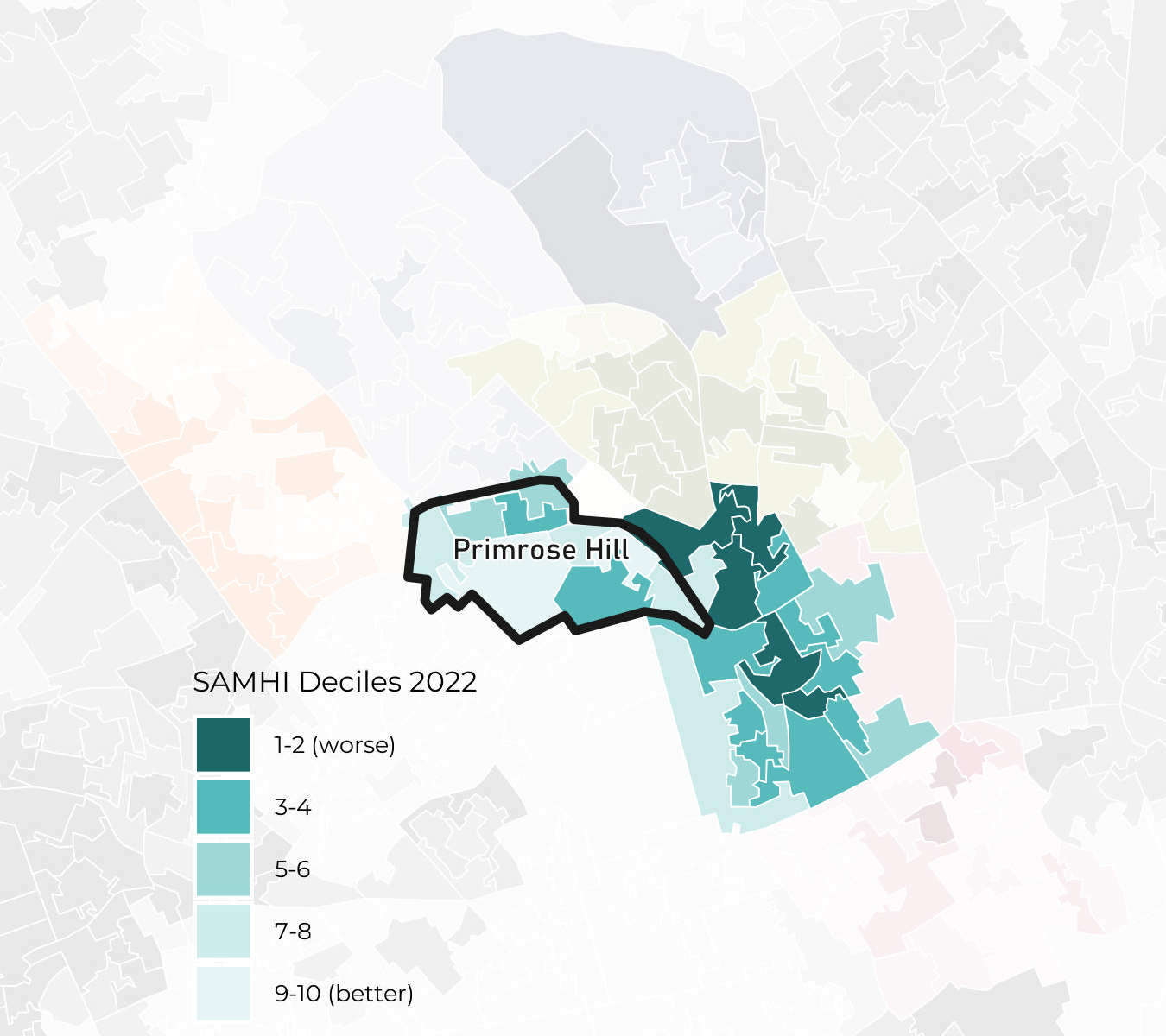 Primrose Hill ward has SAMHI deciles ranging from decile 3 to decile 10. Note that the best decile is decile 10.