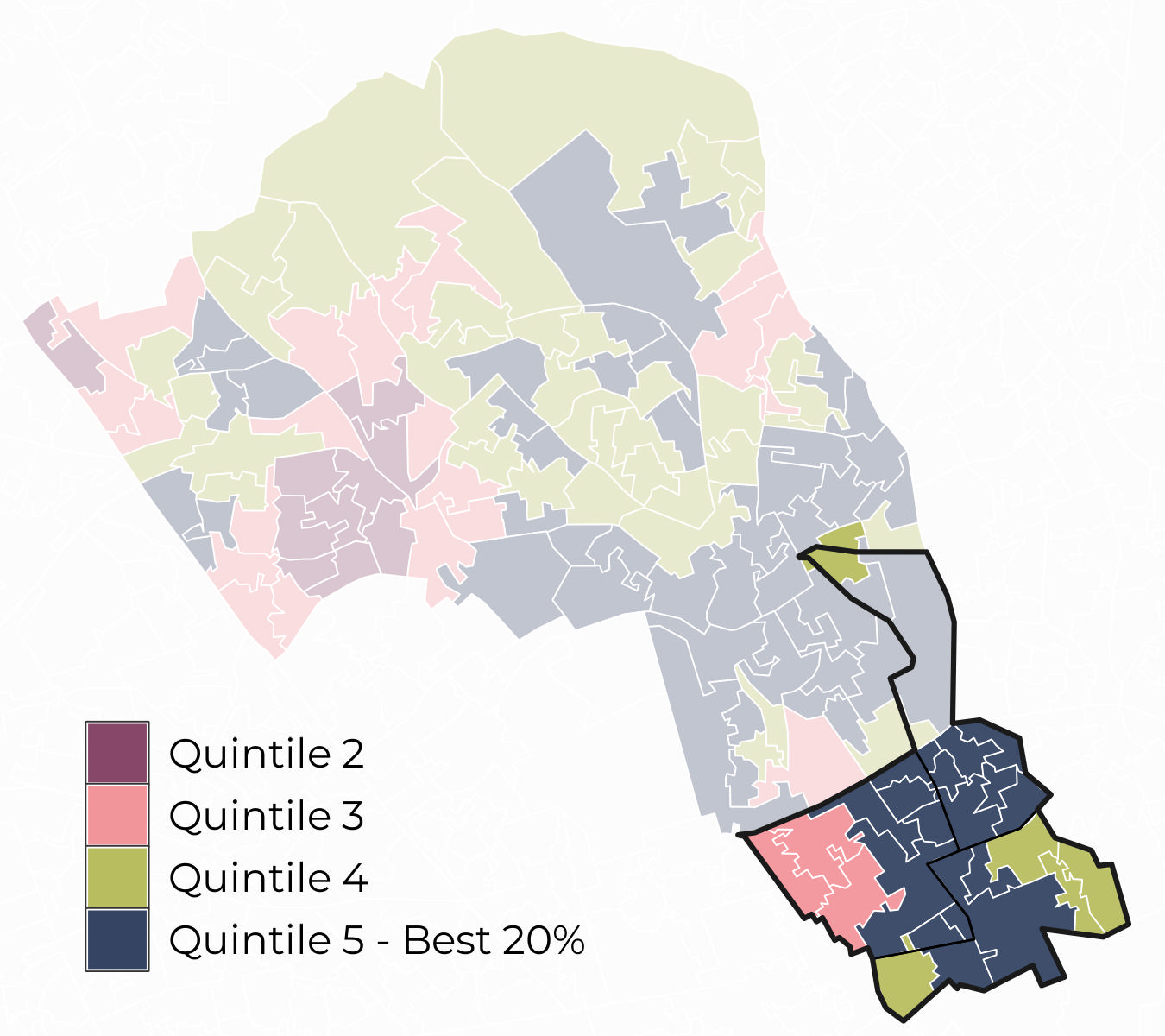 Most Lower Super Output Areas (LSOA) in the South neighbourhood sit within Quintile 5 for access to green spaces and within Quintile 1 for air quality.