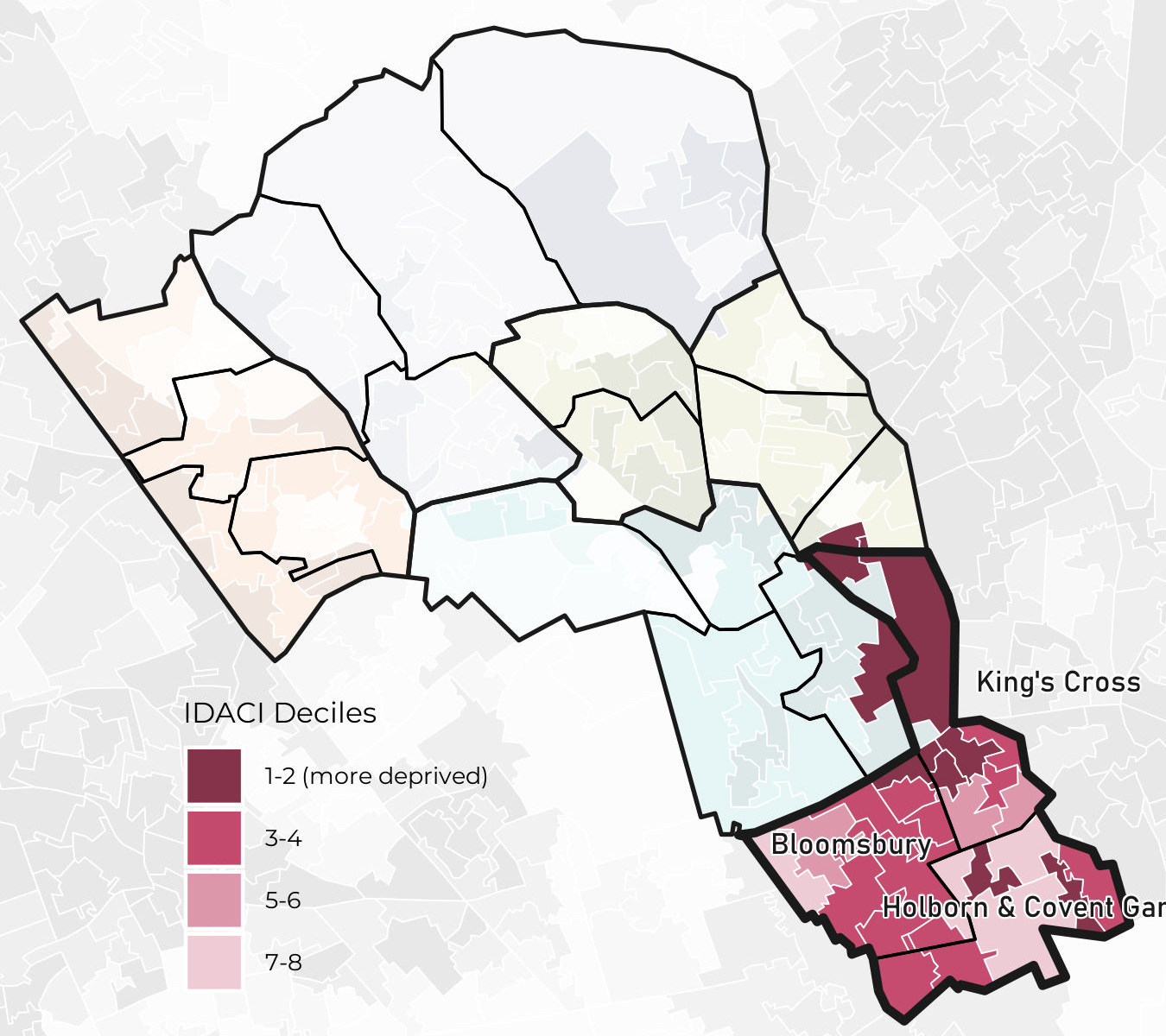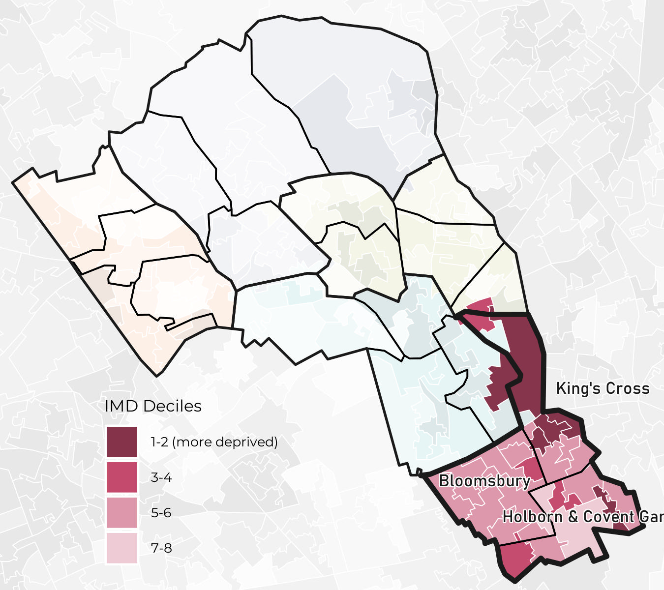 King’s Cross ward has higher deprivation compared to other wards in the neighbourhood while Holborn & Covent Garden has the most variability between LSOAs.