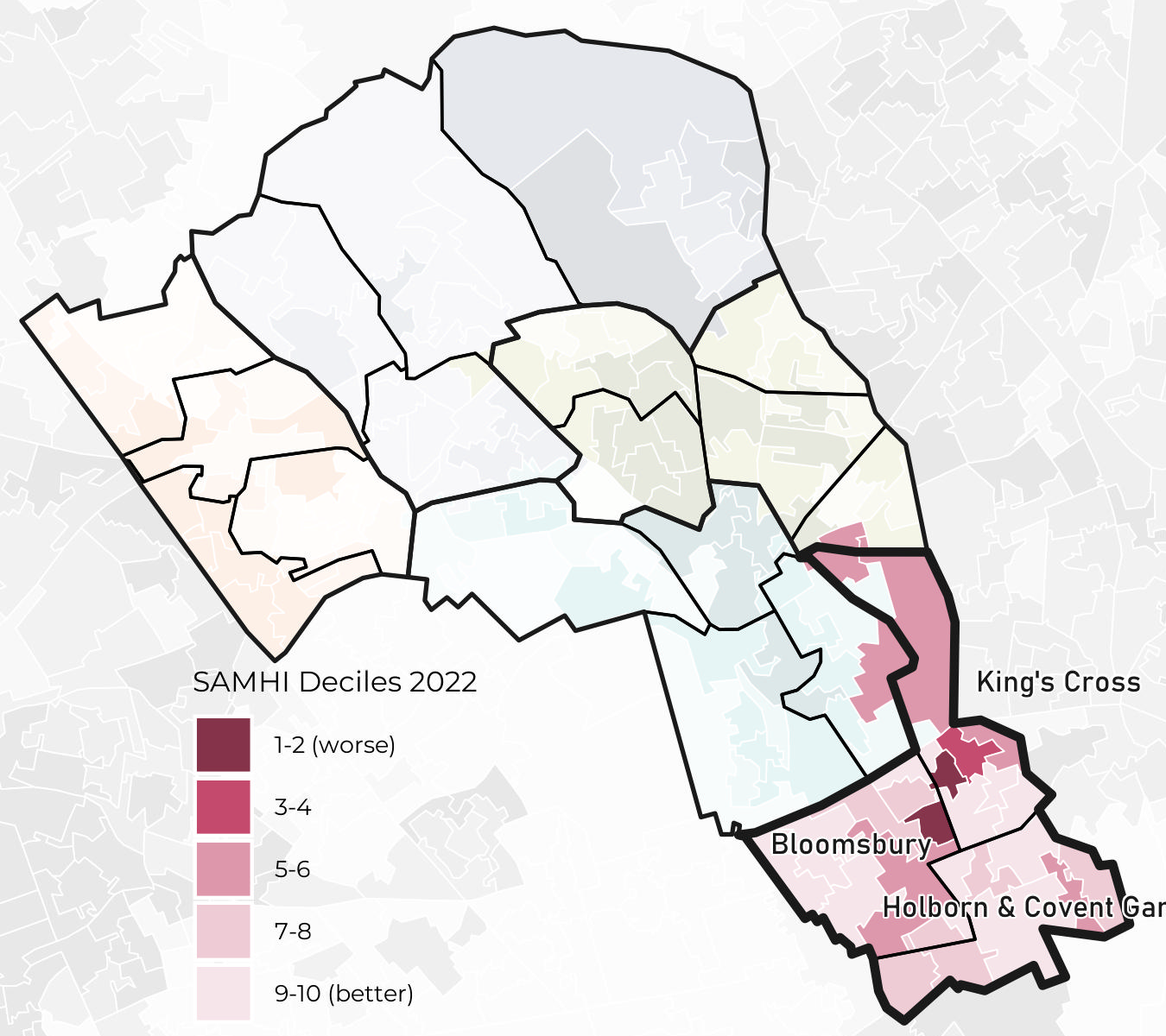 The worst LSOAs in the South neighbourhood neighbourhood according to SAMHI deciles are in Bloomsbury (decile 1) while the best LSOAs are in Bloomsbury, and King’s Cross (decile 10).