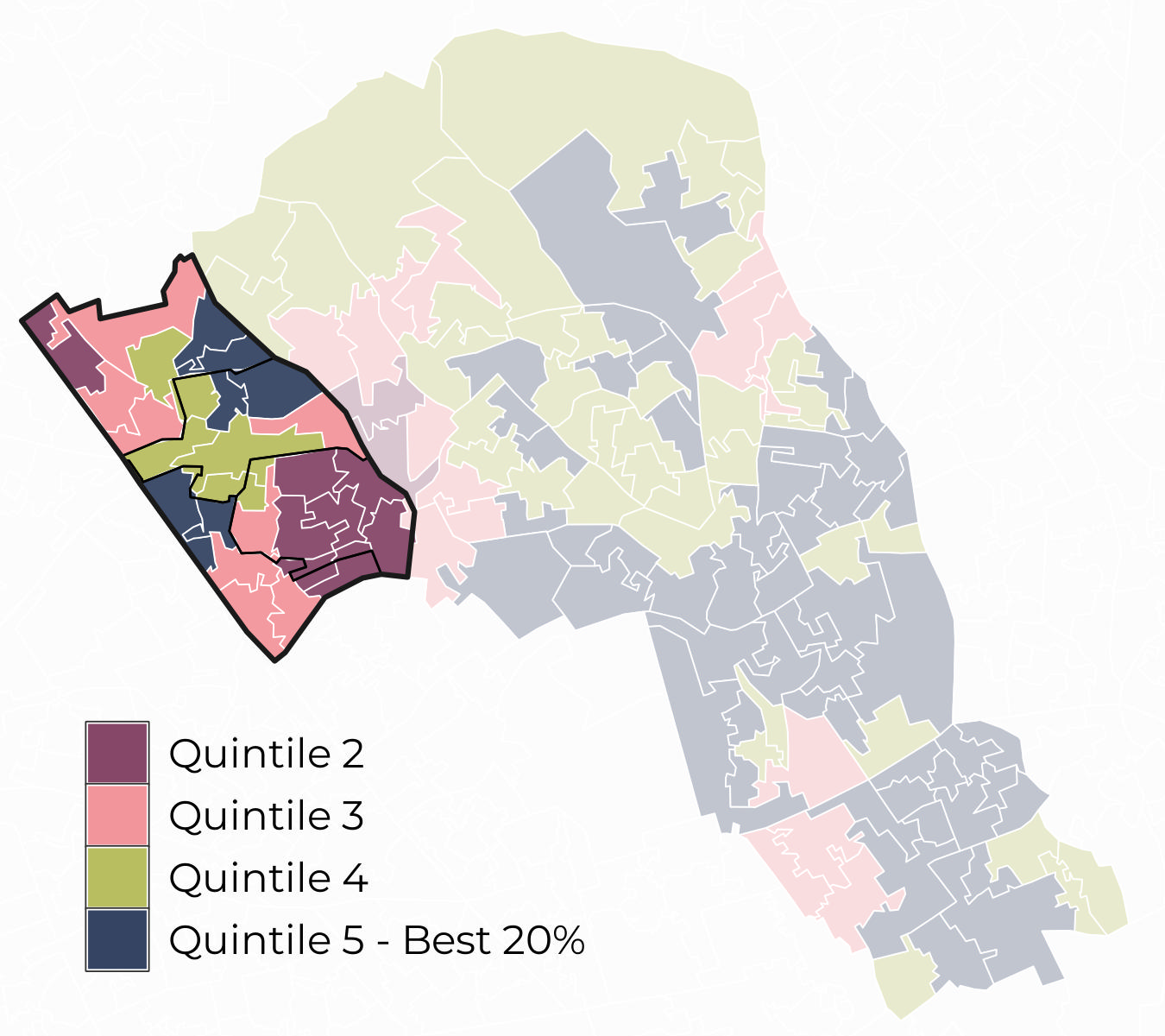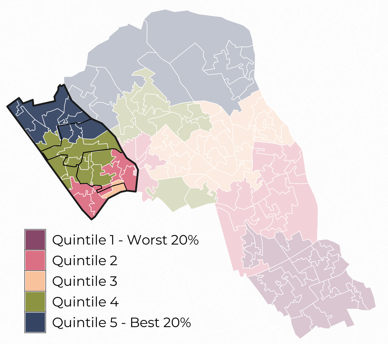Most Lower Super Output Areas (LSOA) in the West neighbourhood sit within Quintile 2 for access to green spaces and within Quintile 4 for air quality.