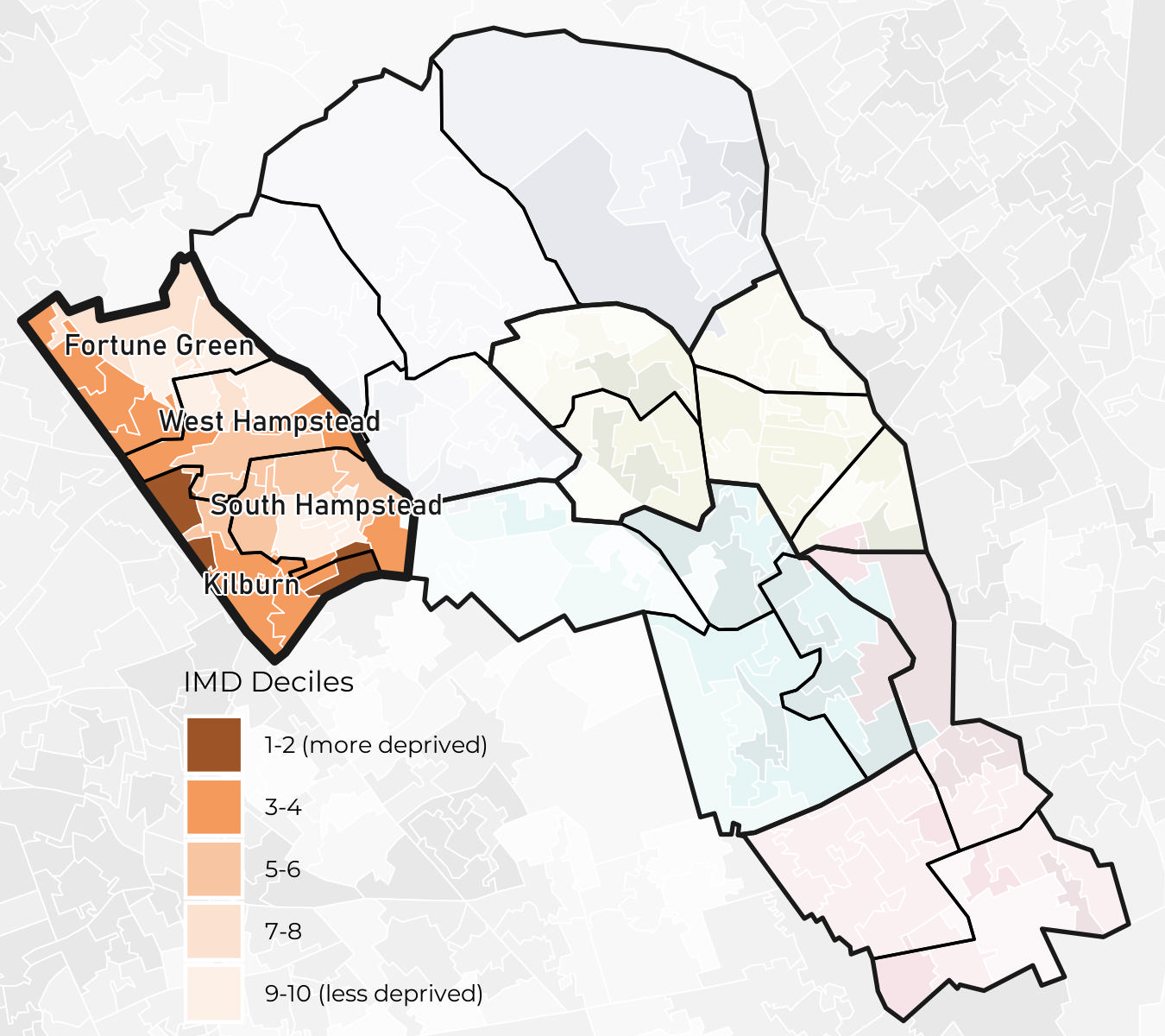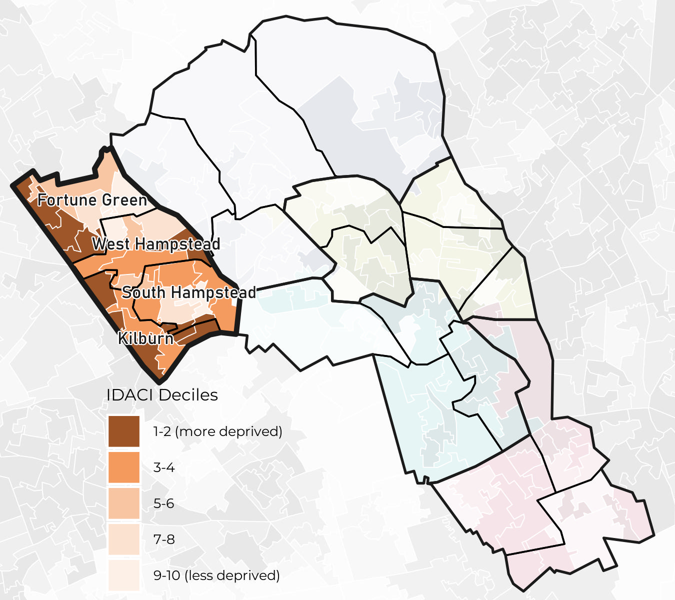 The most deprived LSOAs in the West neighbourhood neighbourhood according to IDACI (Income Deprivation Affecting Children Index) deciles are in Kilburn, and South Hampstead (decile 1) while the least deprived LSOAs are in Fortune Green (decile 10).