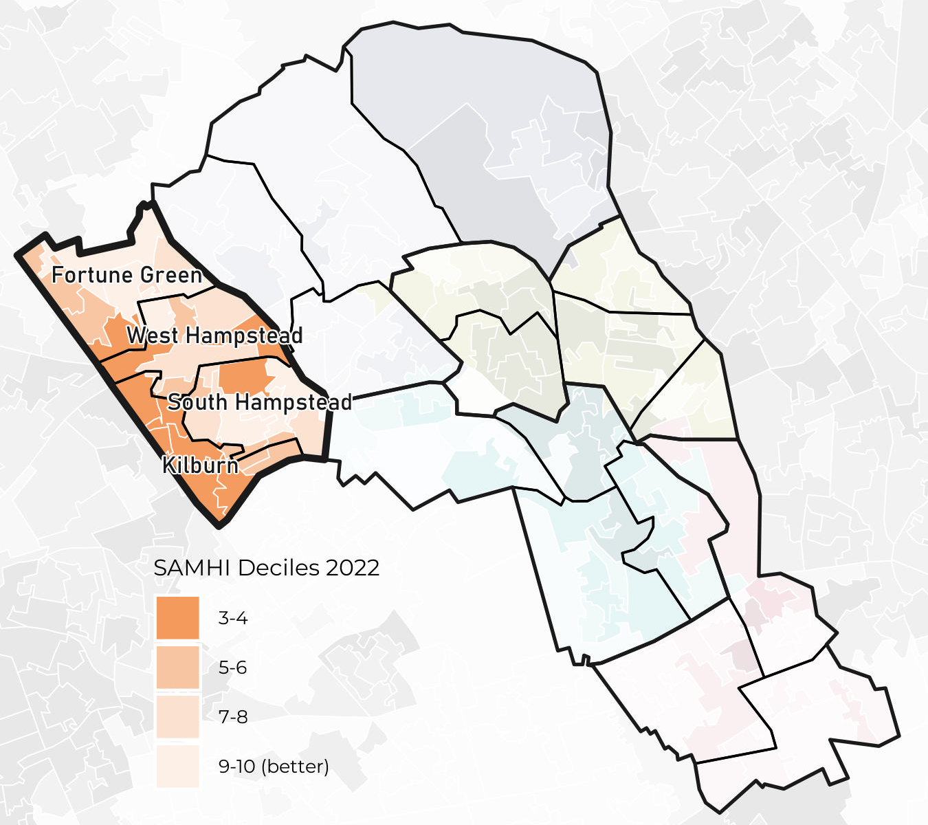The worst LSOAs in the West neighbourhood neighbourhood according to SAMHI deciles are in Fortune Green, Kilburn, and West Hampstead (decile 3) while the best LSOAs are in Fortune Green, South Hampstead, and West Hampstead (decile 9).