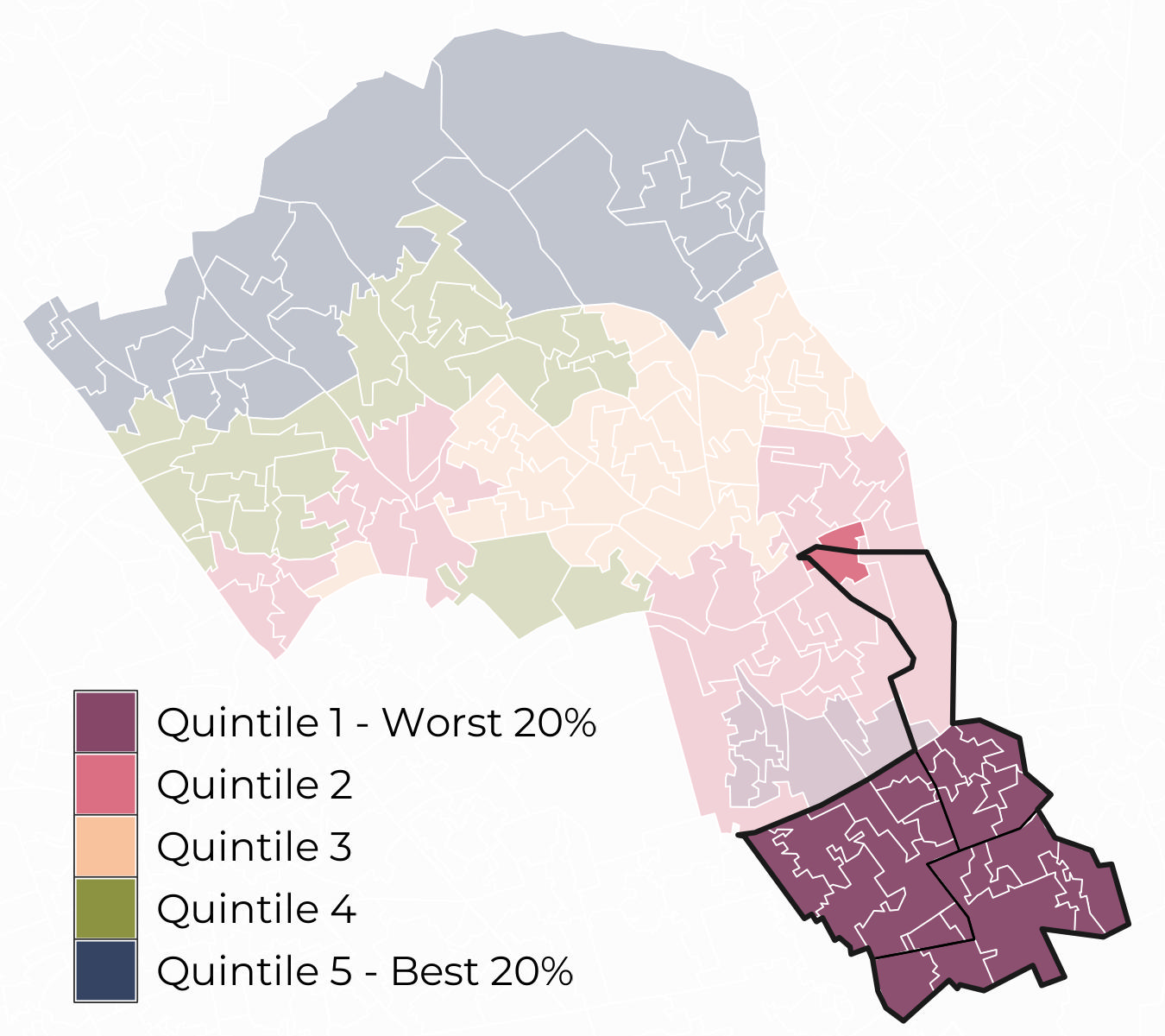 Most Lower Super Output Areas (LSOA) in the South neighbourhood sit within Quintile 5 for access to green spaces and within Quintile 1 for air quality.
