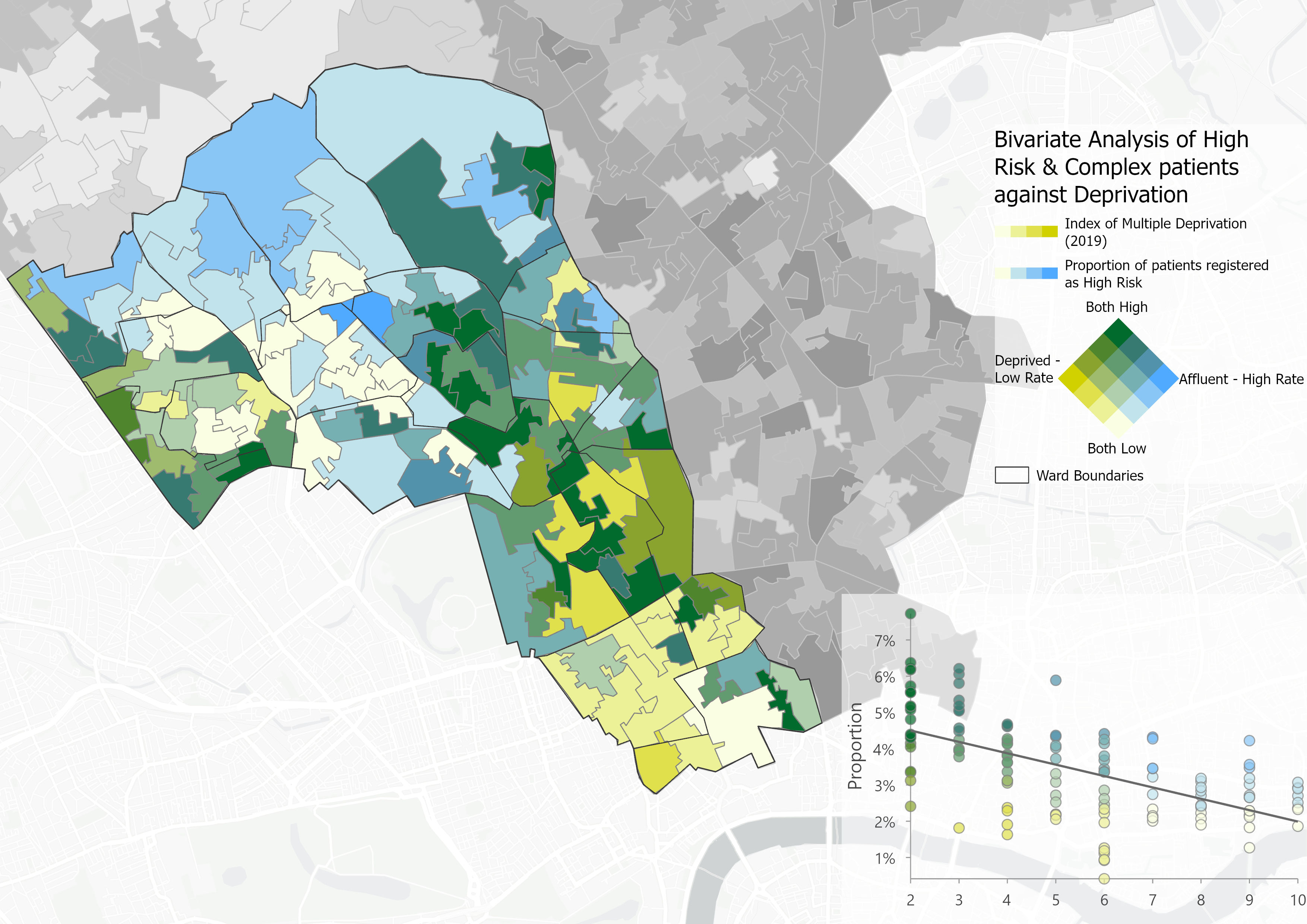In Camden, the Eastern and Central parts of the borough, and those around Kilburn, exhibit both high levels of deprivation and LTC complexity, suggesting these areas are likely to have the greatest health and care needs. The North of the borough also has high levels of LTC complexity, largely due to the older age demographic, although these areas are characterised by low levels of deprivation. Meanwhile, areas around the South show high levels of deprivation but lower LTC complexity, likely due to the younger age demographic.