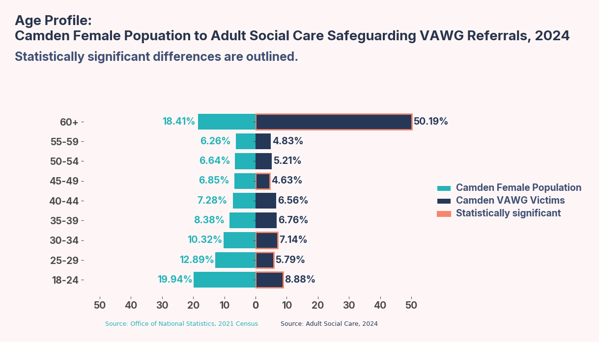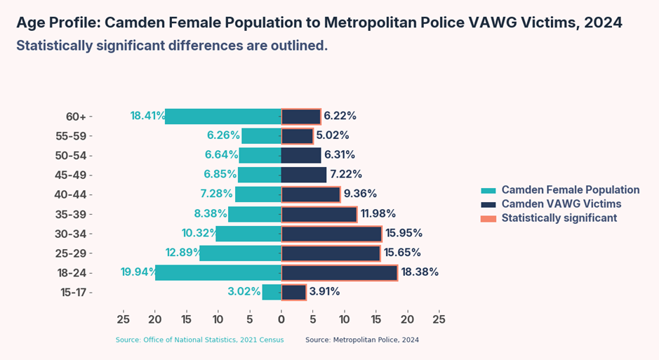 Younger women (18 to 24 years old) are the single largest victim/survivor group in Camden, especially for sexual offences, yet they are less likely to progress through referral pathways in CSN.
